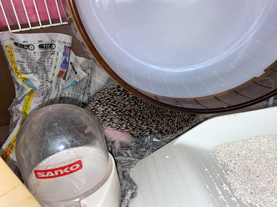 わたしも部屋の温度調節には気を使っている方ですが、それでもたわしちゃんにとっては回し車の下に挟まっているのが一番暖かいみたいです…どうして(汗)。