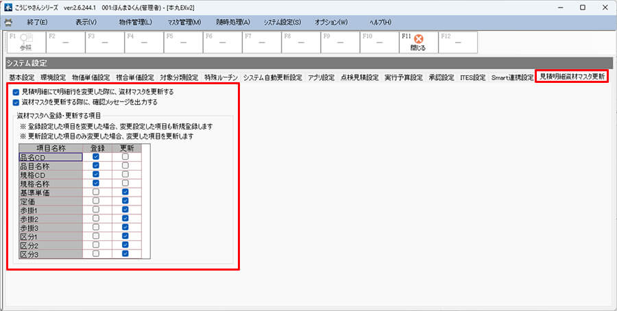 見積明細入力画面で、資材マスタを参照して入力した内容を資材マスタに登録・更新することができます。はじめに、資材マスタに登録・更新する機能を設定します。