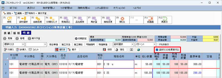 見積作成で入力した明細を資材マスタに追加・更新できる便利な機能です。資材マスタのメンテナンス作業を省力化できます。ぜひご活用ください!