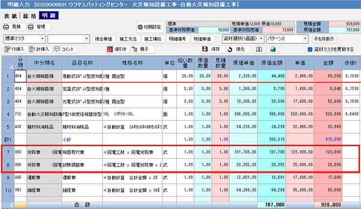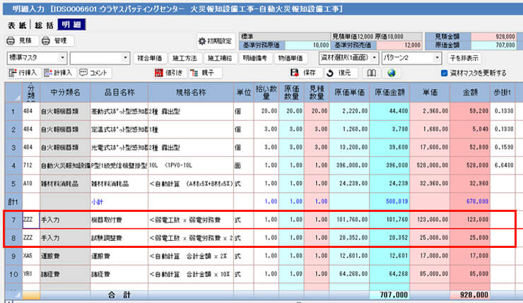 労務費を入力する際、明細画面に手入力すると、労務金額に集計されません。 手入力した労務費行の中分類を変更することで集計対象にできます。特定の明細行の中分類を変更する手順をご説明します。