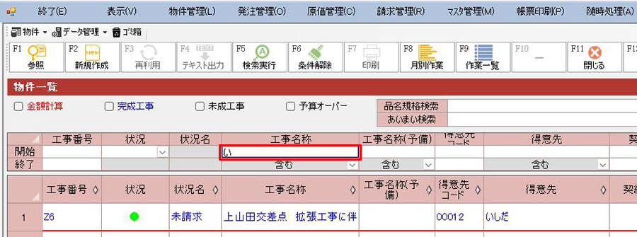 例)物件一覧の工事名称の検索欄で「新築」と入力する場合