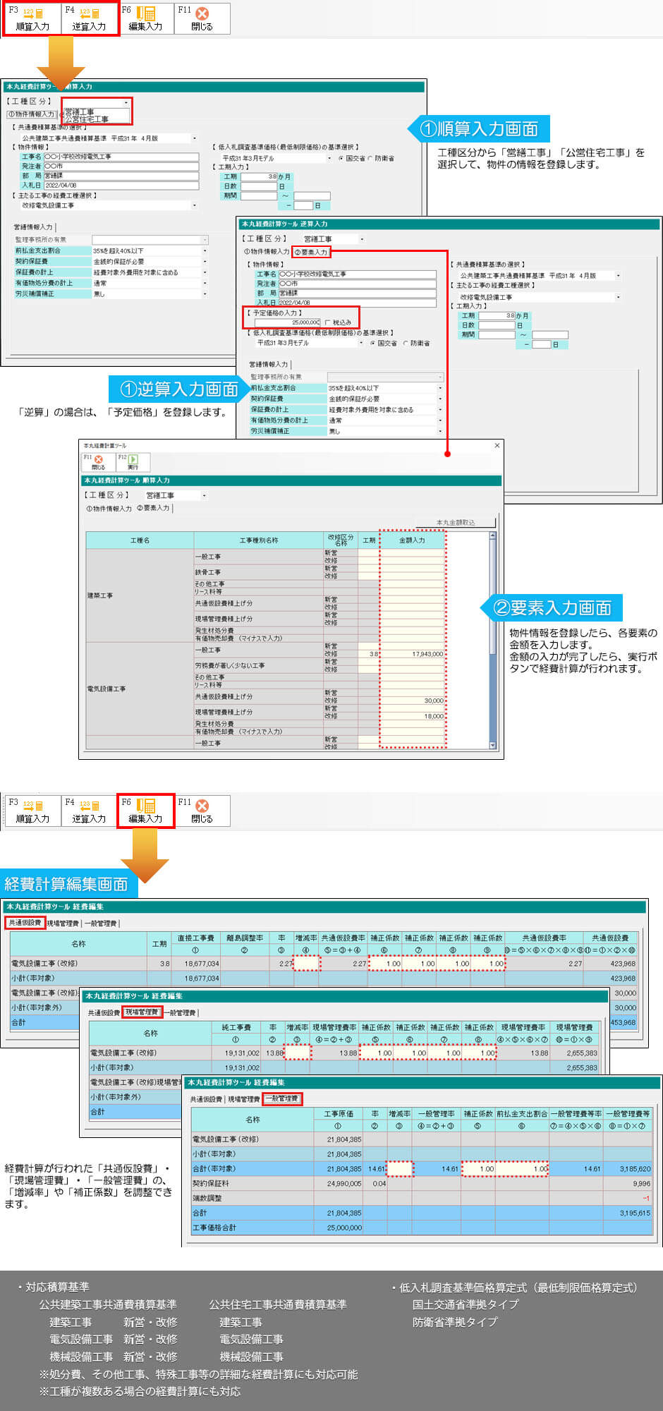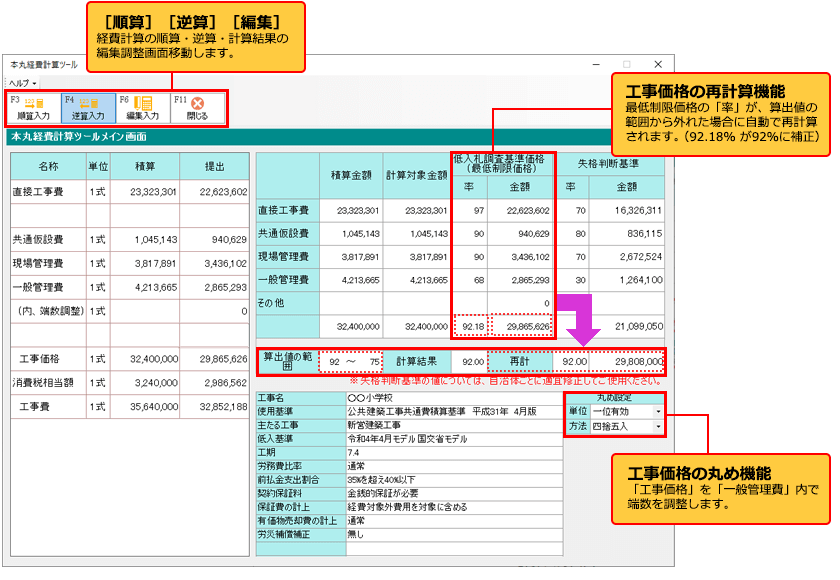 「順算」または「逆算」に必要な計算情報を入力する画面です。 算出後に「共通仮設費」「現場管理費」「一般管理費」の「増減率」や「補正係数」などを編集して計算することもできます。